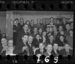 Large group of residents at a reception in the ghetto; man holding a framed award in the back