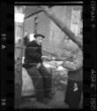 Man and child making exchange through barbed wire fence