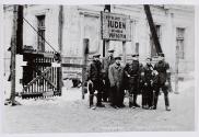 Six men pose outside of restricted ghetto area underneath 'JUDEN' sign