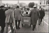 Men who were injured in the Great War march with walking sticks down the street with a motorized wheelchair as part of a protest for the disabled