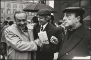 The painter Renato Guttuso (left) is greeted by friends at an event in the rain