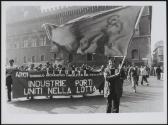 A march in Livorno by port workers, 'United in the Fight' the banner being carried reads, and a man walking in front is waving a flag where the hammer and sickle is visible