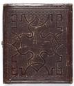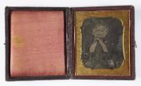 Mediumdaguerreotype in brown embossed paper covered wood case with flower and scroll motif (verso), interior with red silk pad