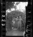 Couple with a dog standing under vine arch